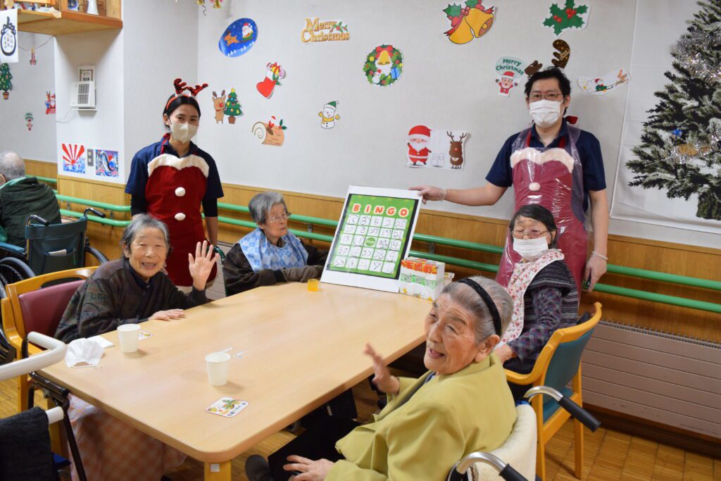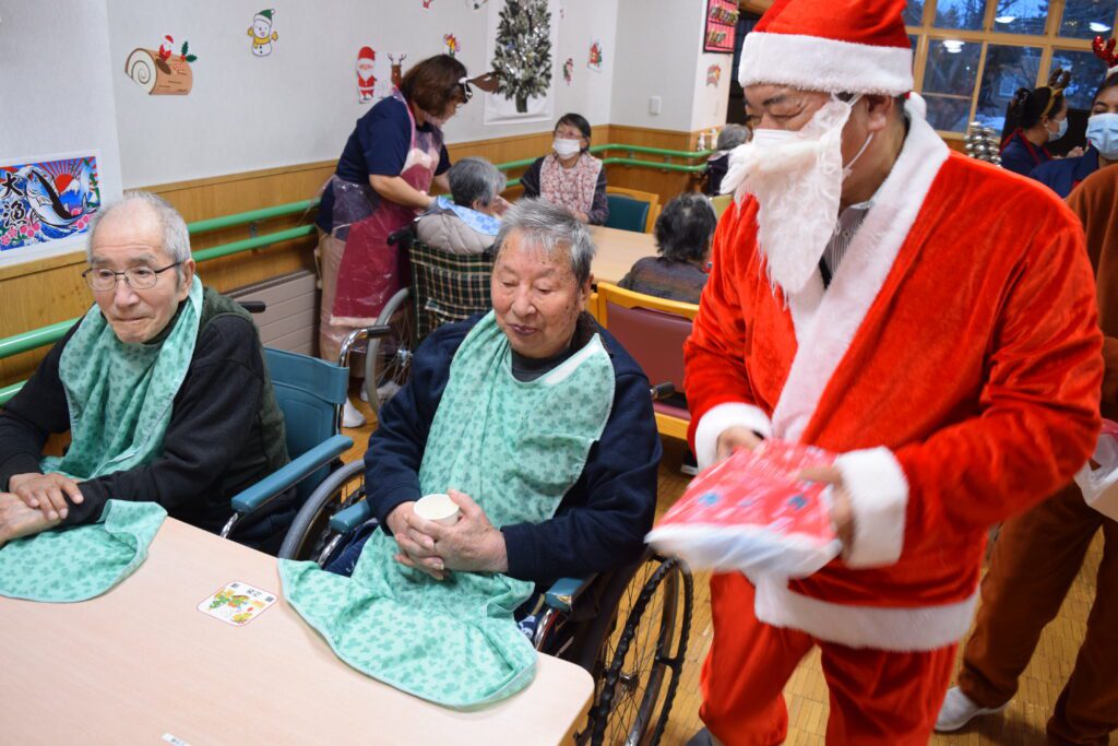 12月17日(水)に、しおさい園にサンタさんがやってきました!入居者の皆様1人ひとりにプレゼントをいただき、その後はケーキを美味しく召し上がり、最後にビンゴ大会を行いました。しおさい園のクリスマスは、今年の締めくくりとして楽しく開催することができました。